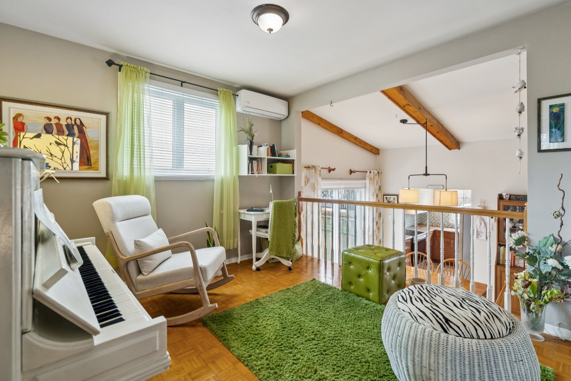 Tringles et rideaux salle à manger et salon (jaune), petit rangement gris cour arrière, tablettes salon et petite chambre, tringles et rideaux petite chambre.